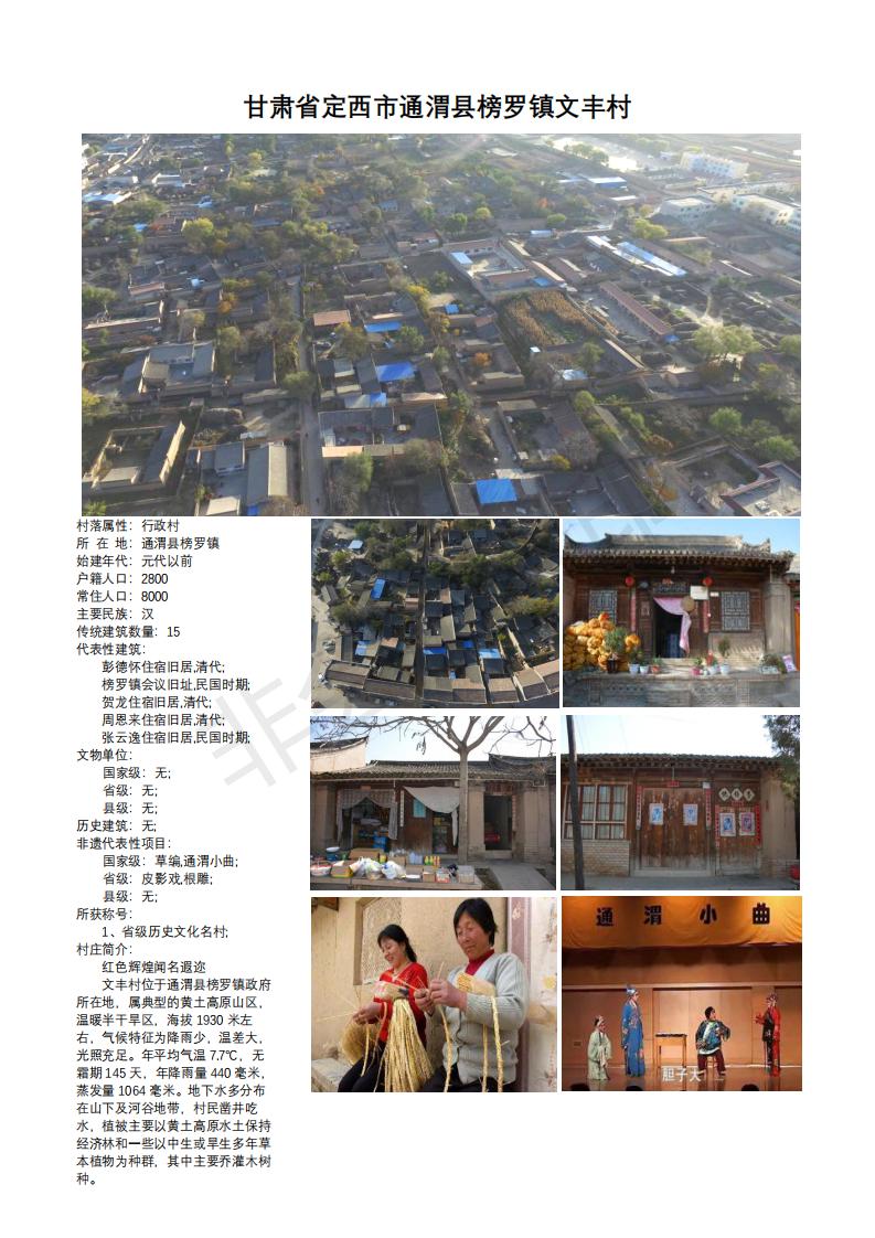 12月10日,住房和城乡建设部网站公布了《关于第五批拟列入中国传统村落名录的村落基本情况公示》,第五批拟列入中国传统村落有2646个村,甘肃省7市州17个村。其中我市通渭县榜罗镇文丰村榜上有名。