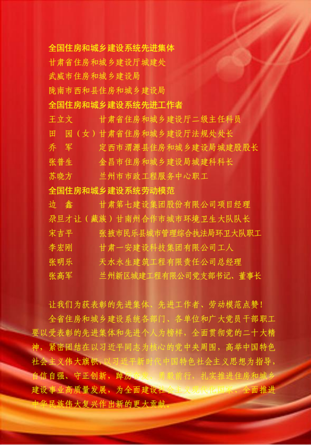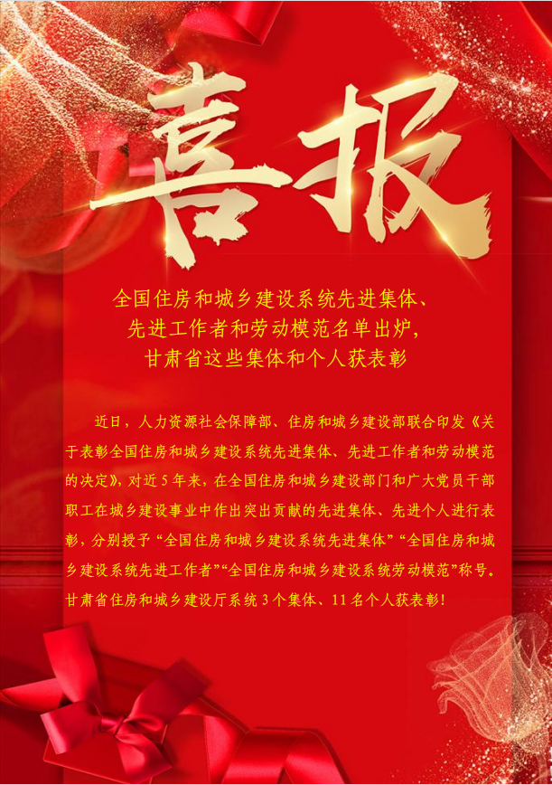全国住房和城乡建设系统先进集体、先进工作者和劳动模范名单出炉,甘肃省这些集体和个人获表彰